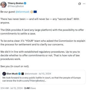 A plataforma respondeu com centenas de contra-argumentos e alegações, algumas das quais incluíam alegações sérias contra a própria UE. Musk alegou que lhe foi oferecido informalmente um acordo para evitar penalidades se ele concordasse em suprimir certos tipos de conteúdo — uma acusação firmemente negada por autoridades da UE. Thierry Breton, que atuou como Comissário da UE para o Mercado Interno na época, refutou a alegação em uma postagem de julho de 2024, afirmando que o X apenas solicitou esclarecimentos sobre procedimentos regulatórios, e nenhum “acordo secreto” foi proposto.