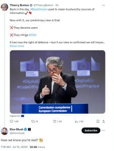 Musk e o X foram notificados oficialmente de que foram considerados uma violação do DSA. No entanto, como escreveu recentemente o Comissário do Mercado Interno da UE, Thierry Breton, sobre o X, estas conclusões não são definitivas e agora eles tem o direito de defesa.